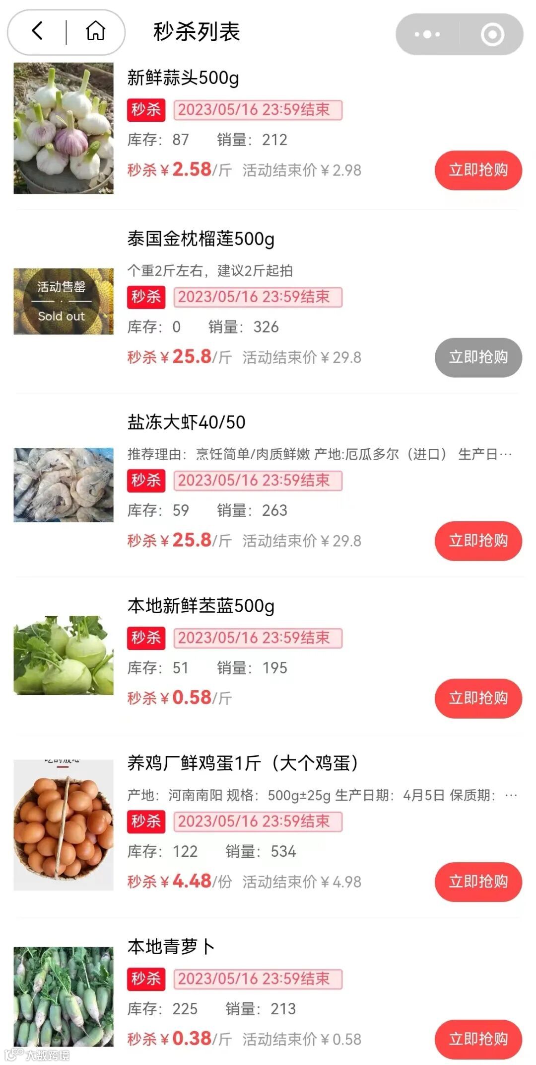 营销玩法:营造促销氛围,打造产品稀缺性,选取多款丰富商品,涵盖水果蔬菜日用百货,4月秒杀订单数2865,总金额达5W+。