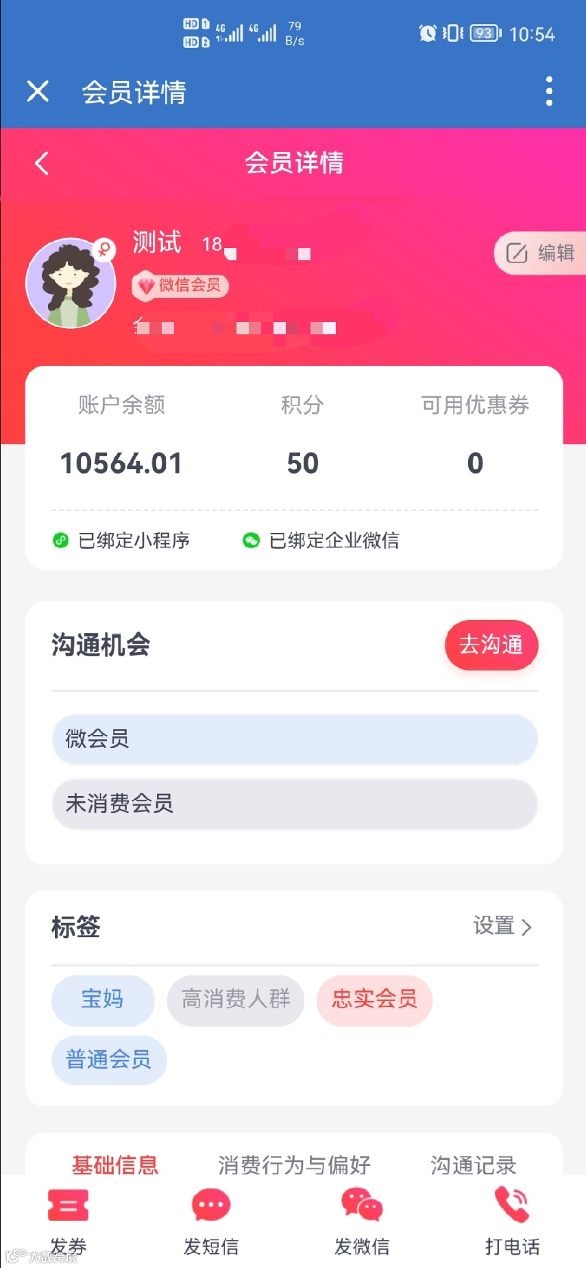 商家在思迅智慧导购给会员贴的标签,第2天都会自动同步至企业微信,并与企业CRM系统打通。后续导购就可筛选标签,对客户进行营销触达,比如朋友圈群发、公众号消息群发等。