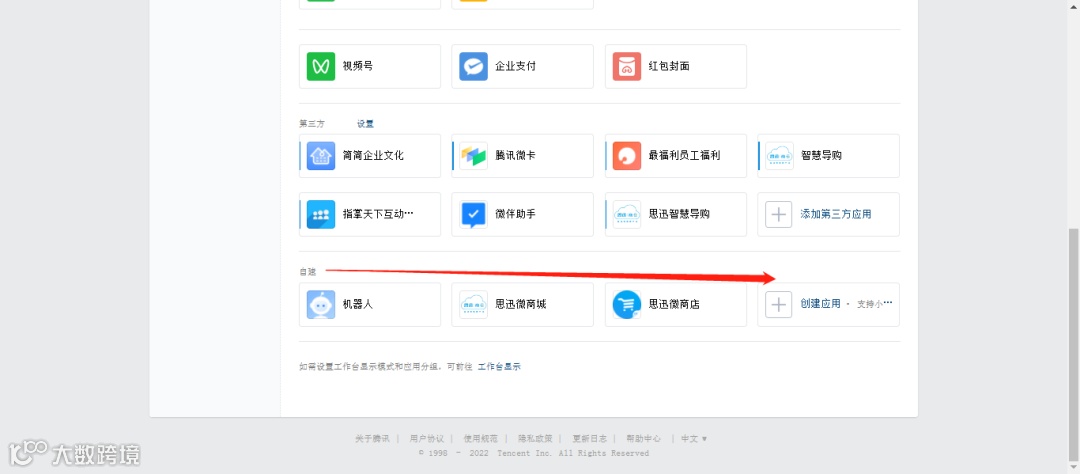 首先,登录企业微信后台https://work.weixin.qq.com/,进入到应用管理——应用——点创建应用。商家填写自家小程序时,如下,填写完毕后,点创建应用即可完成。