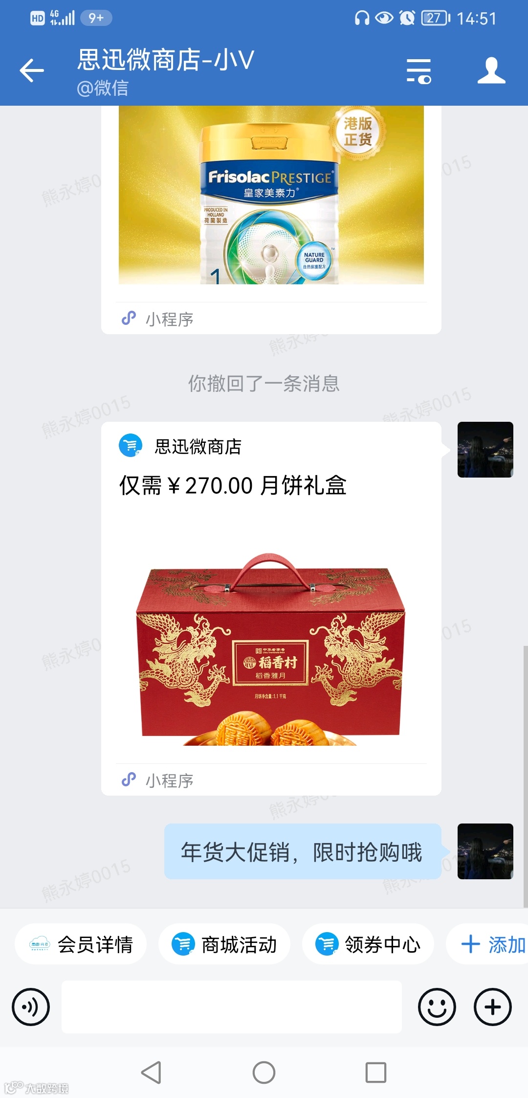 商家员工通过企业微信与会员的聊天时,可以根据对客户的了解,一键发送对应的活动,无需切换程序,让客户快速参与。