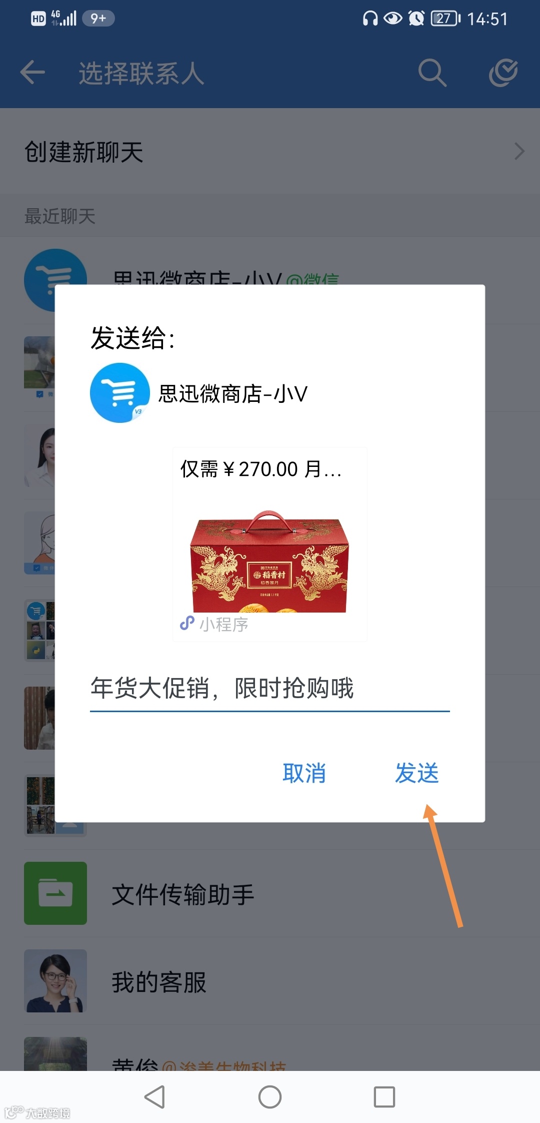可在企业微信的多个位置展示思迅微商店,便于商家与客户多面交流。例如:配置聊天位置,在与客户聊天的过程中,可以把商城直接发送给顾客。