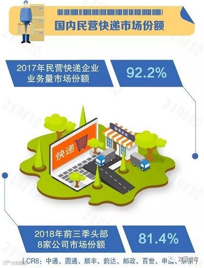 数据显示,7家上市快递公司总市值达4200亿元,顺丰、中通两家市值高于其他5家公司的总市值,顺丰与“通达系”6家公司上年度市场份额占比超6成;2018年,快递业9位亿万富豪入选福布斯中国400富豪榜,其中,顺丰王卫以1028亿元的身家排行中国富豪榜第7位。