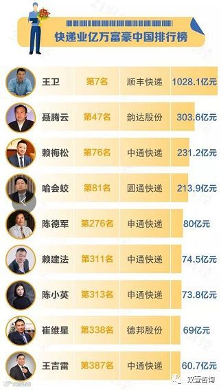 在快递市场持续高速增长的机遇下,顺丰、“四通一达”等公司通过竞争占据市场头部,随着这些行业巨头的上市,短时间内造就快递业的亿万富豪传奇。