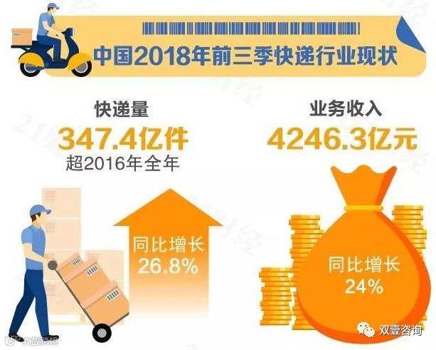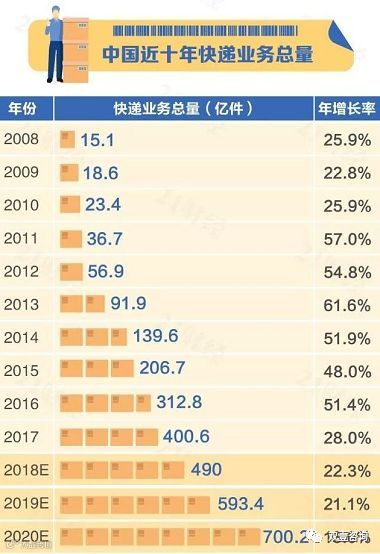 从数据可看出,2017年中国快递量占世界份额超40%,近十年快递量年平均增速超40%;2017年全国快递量增速由51.4%回落近一半至28%,至今年前三季放缓到26.8%;但增长基数庞大,2018年前三季度快递量已超2016年全年总量,预计到2020年快递量将超700亿件。