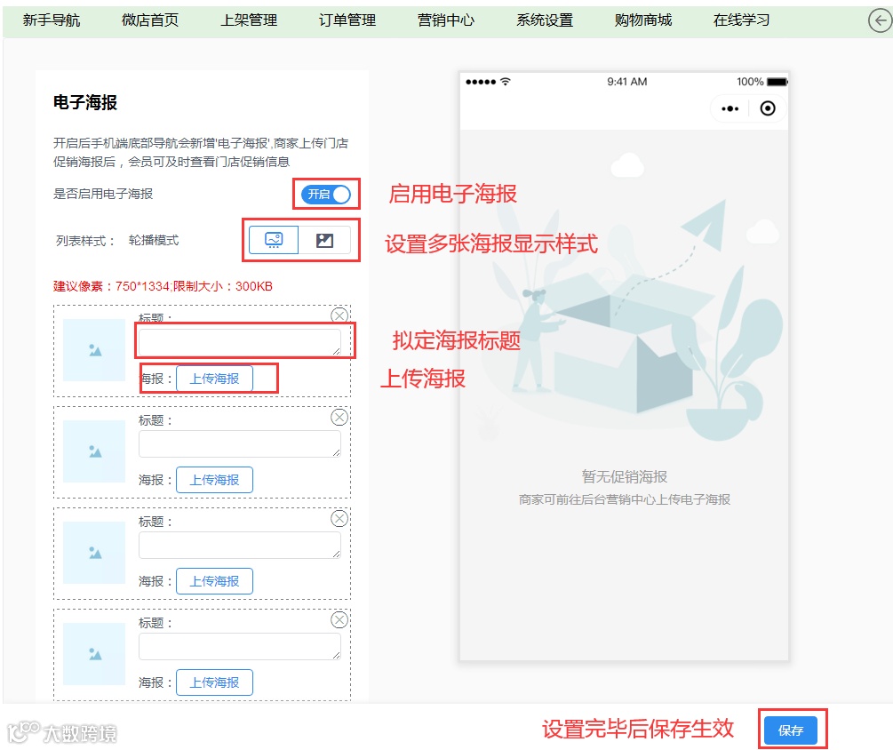 软件后台点击微小店 — 营销中心 — 电子海报。启用电子海报并上传制作好的海报图片,上传成功后保存设置。