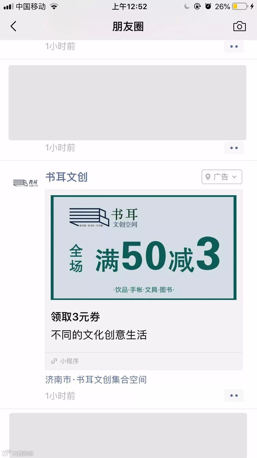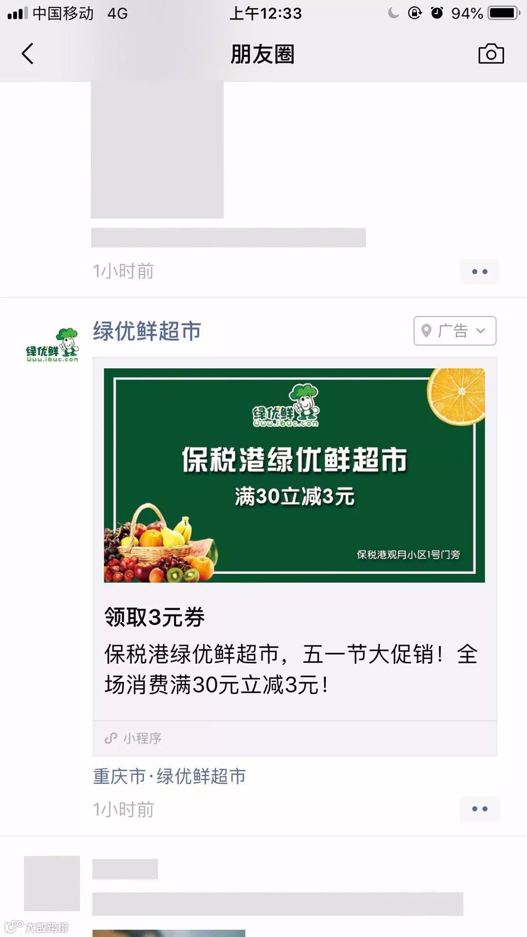 微信朋友圈广告,基于商户门店1-3km范围,发放商户的代金券广告。商户可自定义广告图片、广告文案及代金券门槛等相关内容。