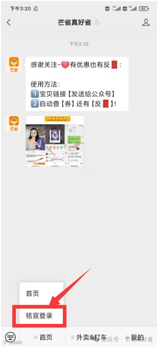 微信搜索 芒省真好省 公众号,关注后点击首页进入,登录铭宣账号(以下是公众号使用教程)
