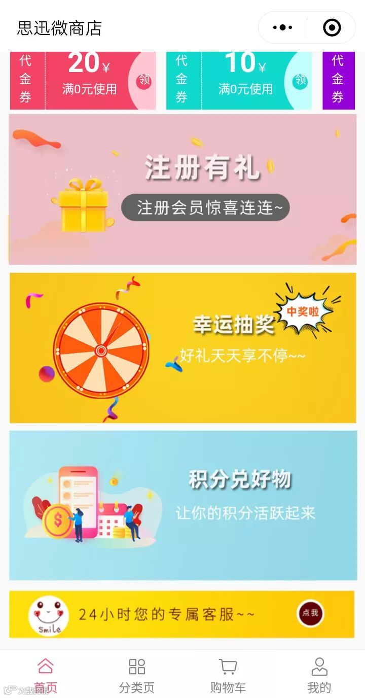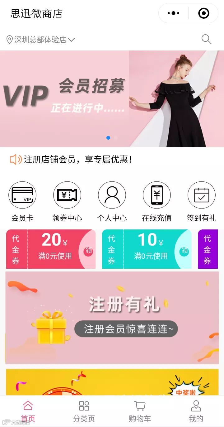 图标导航:会员日常营销插件放置处,顾客进店即可找到所需。可放置电子会员卡,领券中心,在线储值,积分商城,注册/绑定有礼、签到有礼等。