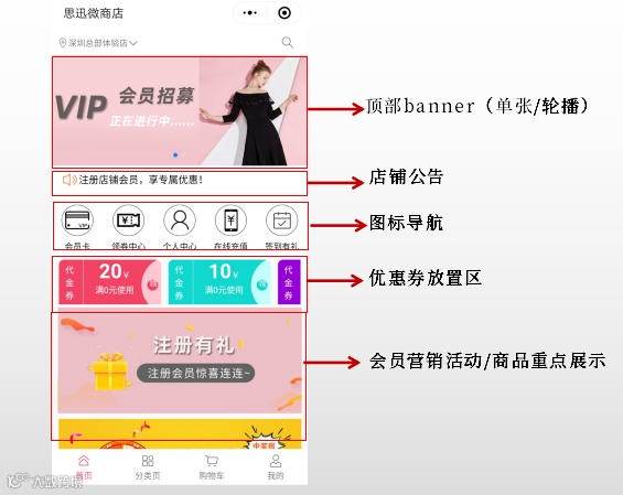 顶部banner+店铺公告+图标导航+优惠券+会员营销/商品活动重点展示区