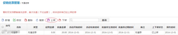 注意:充值送券暂时仅支持顾客首次送券,首次充值(不论金额),将会送所有已经上架的券。
