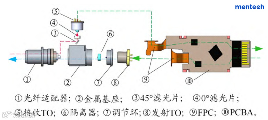 发射1286nm波长光信号传输过程:首先,当DFB激光器发射光信号后,经过非球透镜进行光路汇聚以提高入纤功率耦合效率;其次,再经过⑥隔离器隔离反射光后,防止反向光影响到DFB的工作性能;最终,再水平穿过③45°滤光片后进入①斜8°角的光纤适配器。