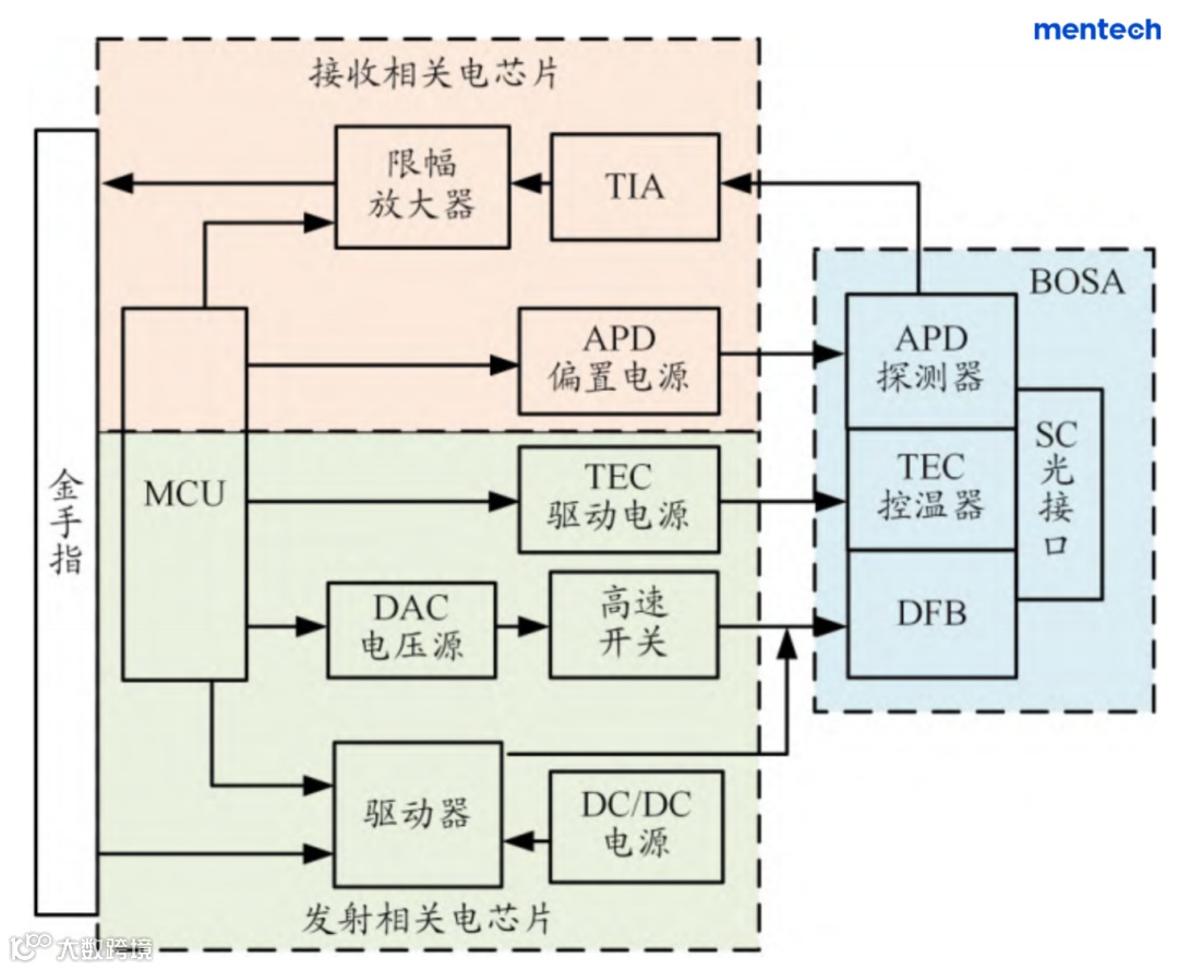 铭普25G ONU光模块,支持高达25Gb/s的传输速率,采用不归零编码(NRZ)调制方式,支持双向传输,并通过波分复用技术实现单纤双向传输。整体结构包括发射端和接收端两部分,其中发射端包含控制单元(MCU)、驱动器、DC/DC电源等电芯片,以及分布反馈激光器(DFB)等光器件;接收端则包含限幅放大器、跨阻放大器(TIA)、雪崩光电二极管(APD)等关键组件。