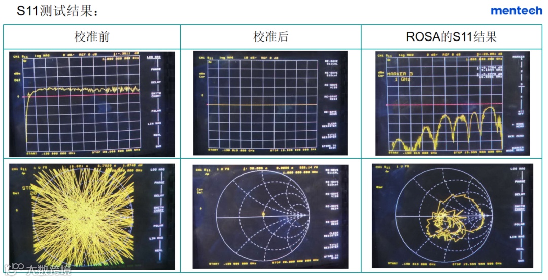 在匹配50Ω负载情况下,测试S11参数的校准前后结果对比图,如下图S11测试结果所示。当S11未经过校准时,测试S11值是一条存在一定波动的非零水平线,并且此时的史密斯圆图显示为杂乱无章的辐射状线条。而当S11经过匹配校准后,测试的S11值是一条光滑的0值水平线,并且测试结果位于史密斯圆图的中心圆点处,表示为阻抗匹配、无反射信号。
