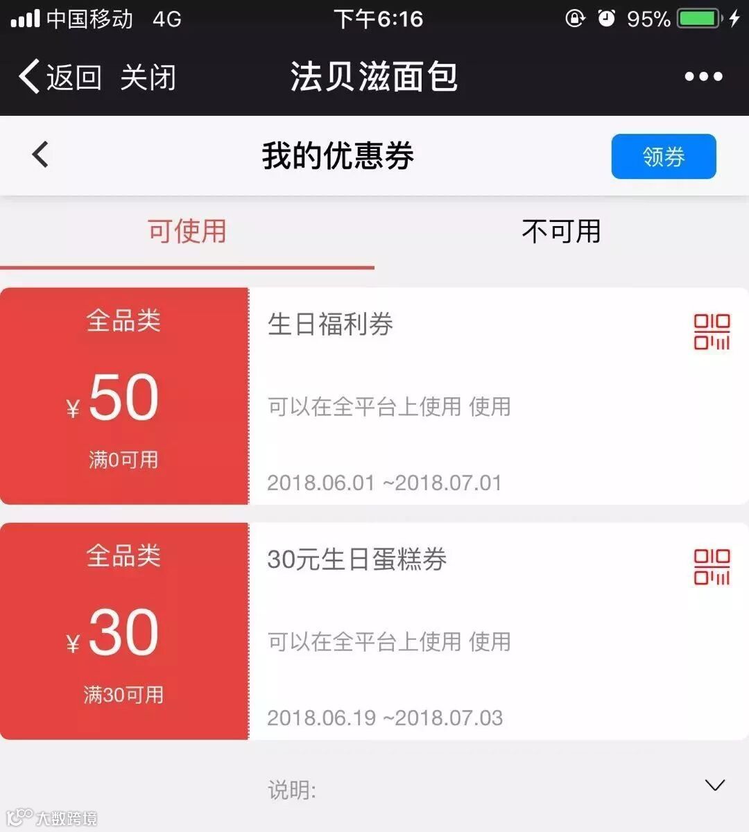 利用优惠券、积分或红包吸引会员注册是思迅微商店较为常用的手段,法贝滋面包同样对会员注册有优惠券赠送。