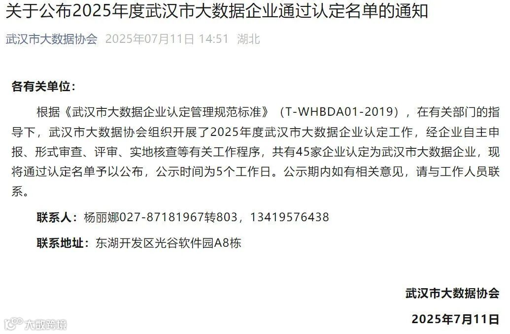 近日,依据《武汉市大数据企业认定管理规范标准》(T-WHBDA01-2019),武汉市大数据协会组织对2025年度武汉市大数据企业认定名单进行了公示,全市共有45家企业成功通过认定。其中,武汉北大高科软件股份有限公司凭借过硬的技术实力和专业能力,再度通过大数据企业认定。