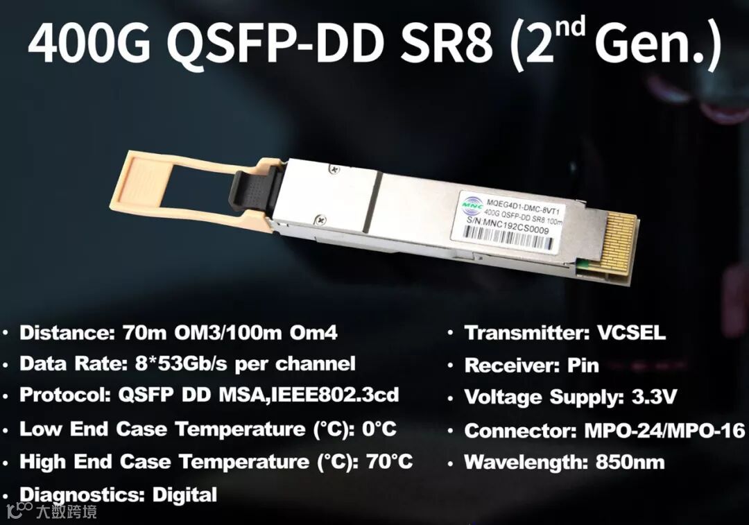 相对于我司在上一届CIOE展会已发布亮相的400G SR8产品,于本届光博会同期上市的第二代400GSR8产品。