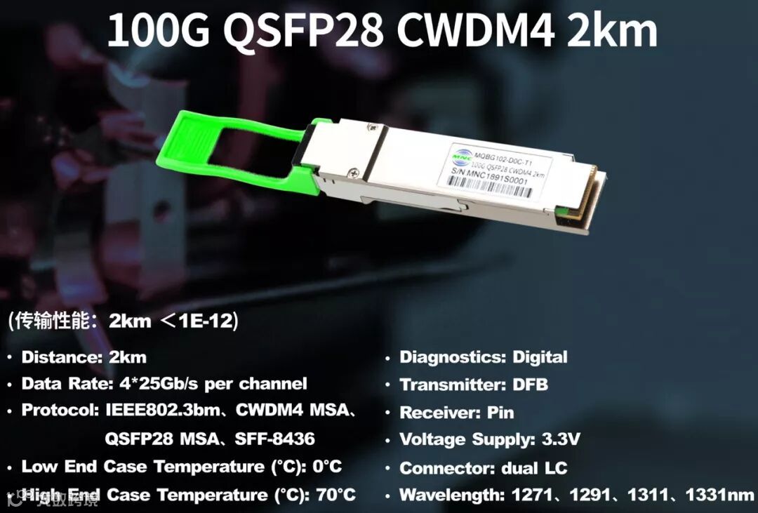 铭普光磁会展出全新研发的100G CWDM4 & 400G SR8/FR4产品,相较于目前市面上已有的100G CWDM4产品,铭普光磁最新推出的100G CWDM4 2km产品有以下几点优势: