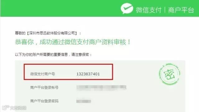 此邮件内账号和密码为保密内容,客户请妥善保管,账号密码将用于后续线下微信支付收款后登陆微信支付商户平台查看账款明细及流水。