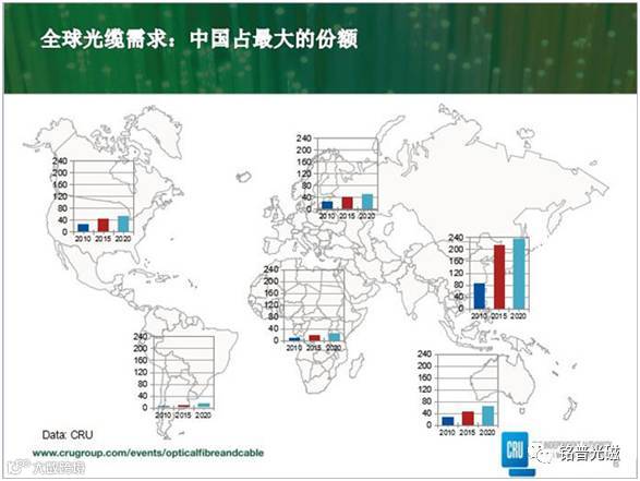报告称,全球光纤光缆需求量已经超过4亿芯公里,中国强劲的需求仍是主要推动力,将继续引领全球增长的趋势。而北美、中国以外的亚太市场的需求保持增势;西欧需求增长有显著提高、东欧市场也在逐步恢复。