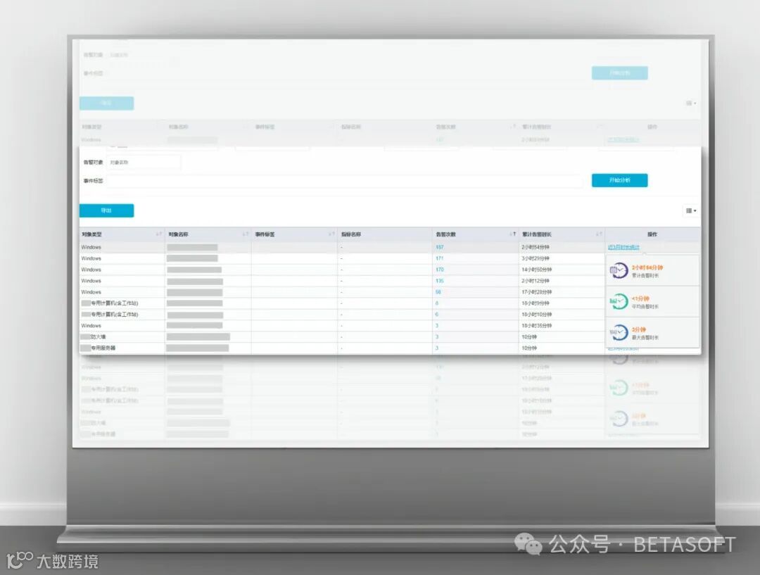 告警数据报表:能够对告警数据按照告警名称、管理资产、告警级别、时间等维度进行检索、查询、导出