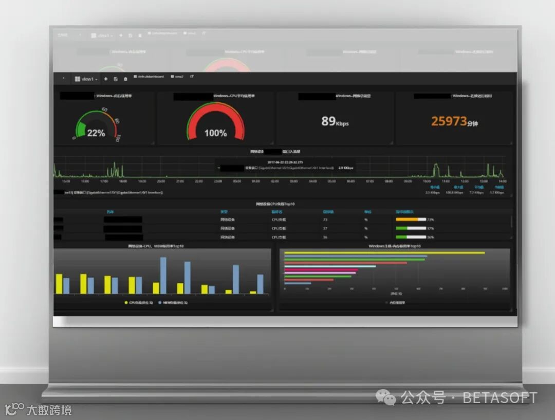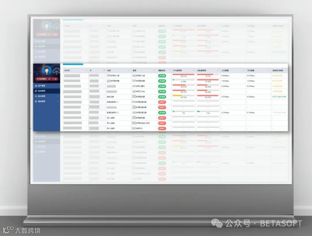 提供对包括信创设备在内的所有设备的关键性能实时展示;提供状态、CPU使用率,内存使用率,上行流量、下行流量、连续运行时间。并以颜色区别显示,为管理提供更为显著的信息。