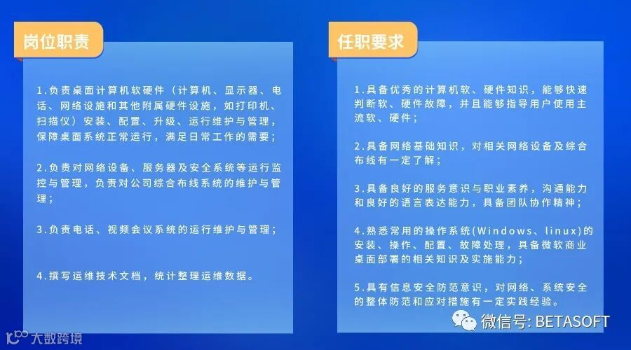 下面的一些细分运维工程师的岗位职责和任职要求来自网络,虽然不能完全代表用人单位的标准,但也可以反映一部分企业对“运维”岗位的人才需求。