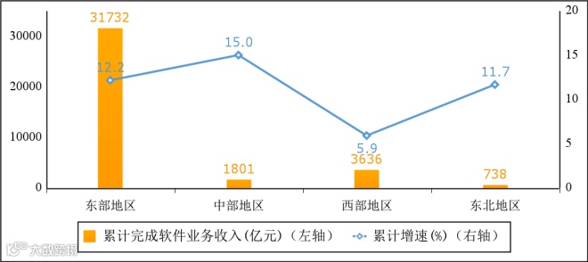 中西部地区软件业务收入增速加快。1—4月份,东部地区完成软件业务收入3.2万亿元,同比增长12.2%,增速较一季度回落0.6个百分点;中部地区完成软件业务收入1801亿元,同比增长15%,增速较一季度提高2.7个百分点;西部地区完成软件业务收入3636亿元,同比增长5.9%,增速较一季度提高1个百分点;东北地区完成软件业务收入738亿元,同比增长11.7%,增速较一季度回落0.7个百分点。四个地区软件业务收入在全国总收入中的占比分别为83.7%、4.8%、9.6%和1.9%。