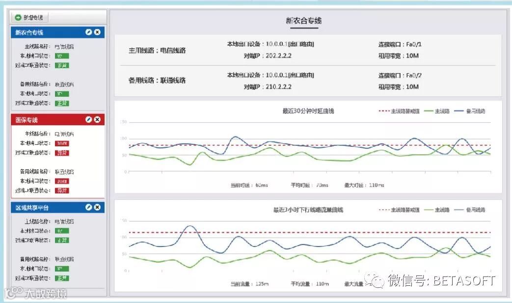 医疗用户实际应用中都有一些重要的网络线路,比如对外的医保专线、新农合专线、区域医疗共享平台等,对内比如总院和分院之间的线路,网络和服务资源之间的网络线路等。