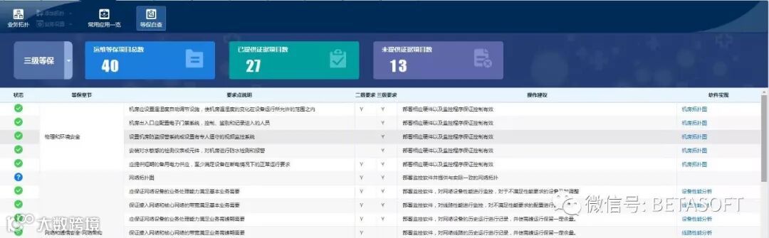 医疗行业用户中三级甲等医院要求每年需要通过三级等级保护。参照等级保护通用标准V2.0送审稿中的具体要求,北塔软件在该版本中内置了等级保护自查管理功能模块。