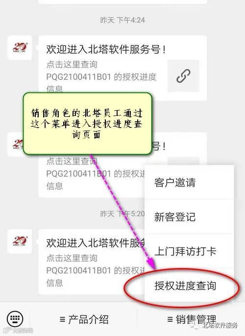 本系统允许北塔软件拥有销售角色和工程师角色的员工在“北塔软件服务”公众号上查询指定客户平台(PUID)的在北塔总部系统中的注册授权申请处理进度情况。