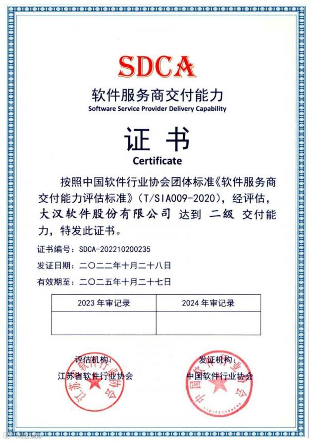 近日,大汉软件通过江苏省软件行业协会一系列严格审核和专业评估获得SDCA软件服务商交付能力二级证书。本次认证通过,标志着大汉软件交付能力受到行业市场高度认可。