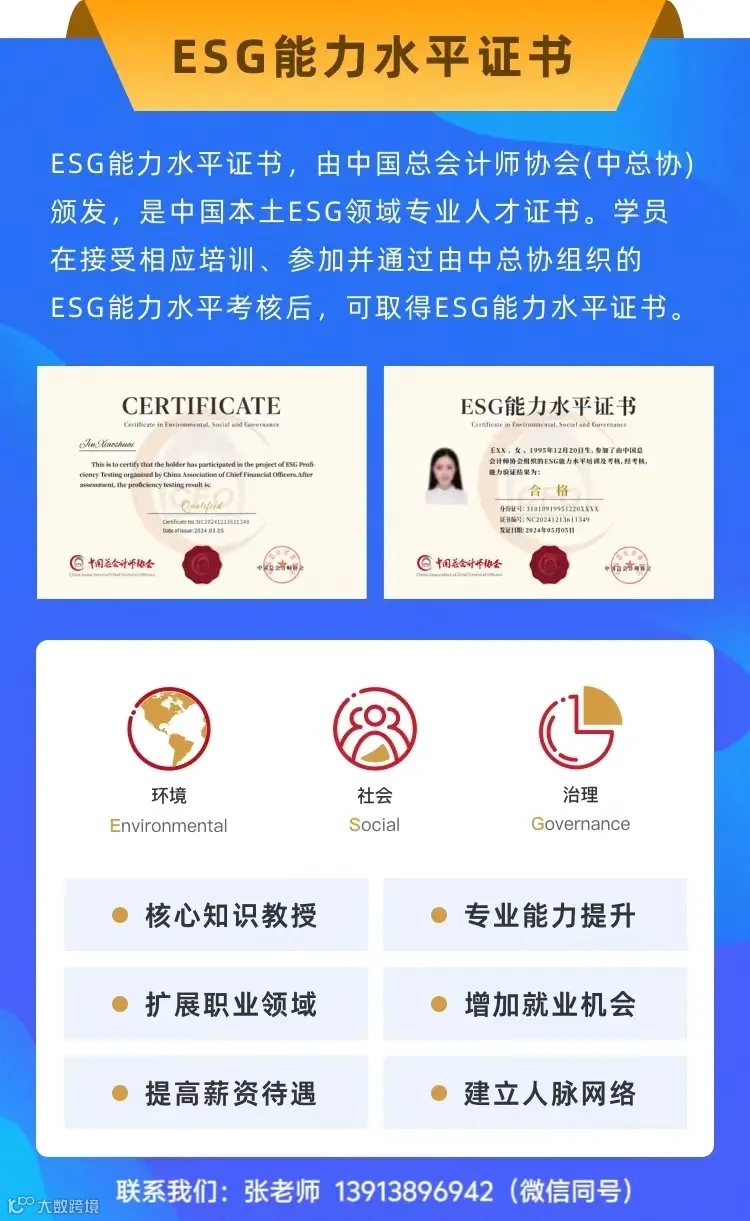 当然,如要想要真正担负起ESG相关职责,必须要进行完整、系统性的学习并取得相关职业能力证书,这样才能为财务人员建立个人能力优势,从而在激烈的职场竞争中脱颖而出。