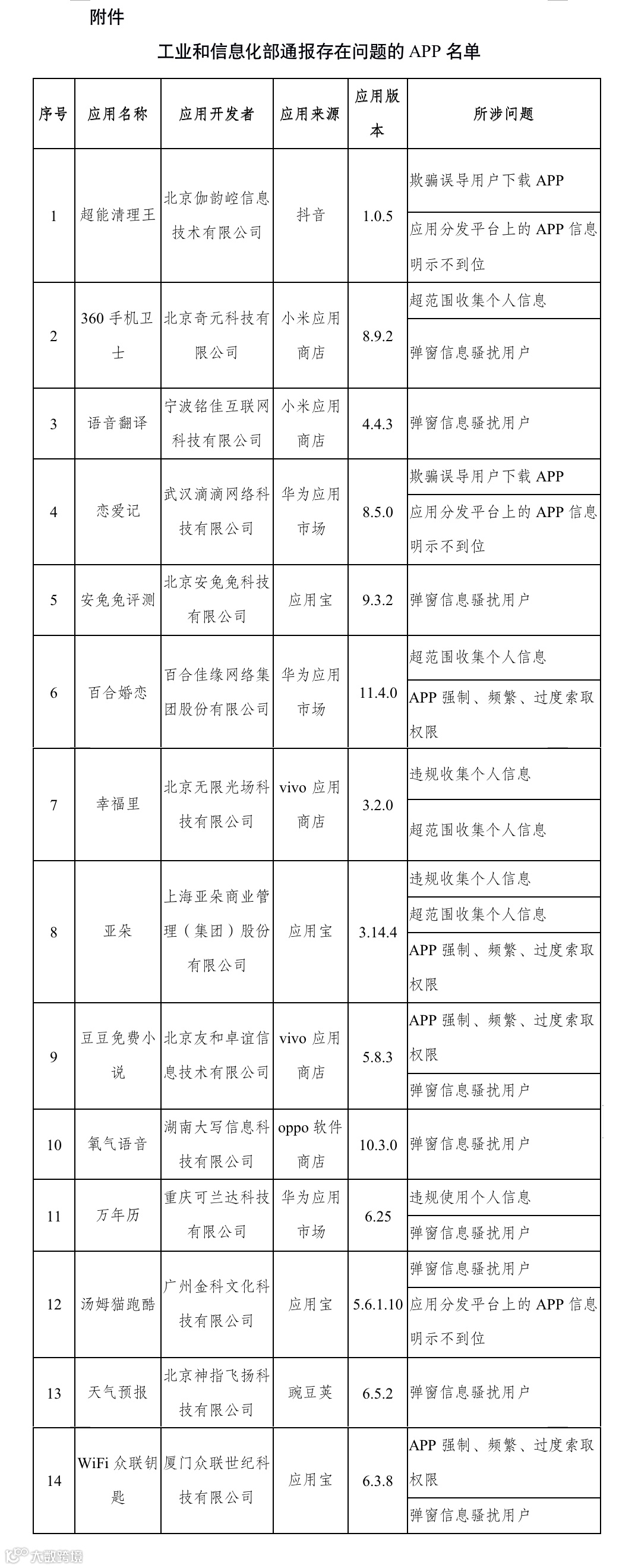 工业和信息化部高度重视用户权益保护工作,持续开展APP侵害用户权益专项整治行动。“3·15”国际消费者权益日来临前夕,为巩固治理成效,营造共同维护消费者权益的良好环境,我部开展APP侵害用户权益整治“回头看”,组织第三方检测机构对前期用户反映问题较多的内存清理类、手机优化类APP进行重点检测,并对去年发现问题的APP进行抽测,共发现14款APP(详见附件)仍然存在问题。上述APP应在3月21日前完成整改,逾期不整改或整改不到位的,我部将依法依规严厉处置。