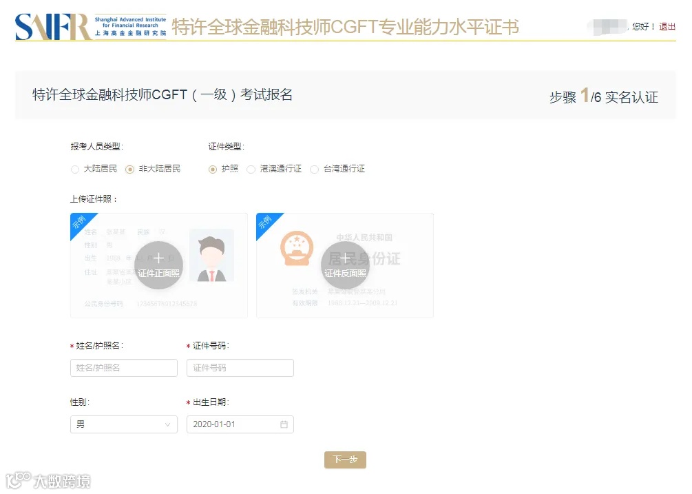 填写证件上的姓名、证件号码、性别和出生日期后,点击下一步。