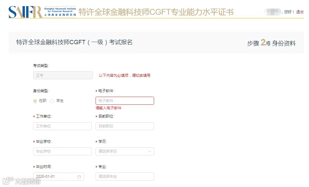对于在职人员,需提交:电子邮箱、工作单位、目前职位、毕业学校、学历、毕业时间和专业。同时上传学历证明文件,如下图二。