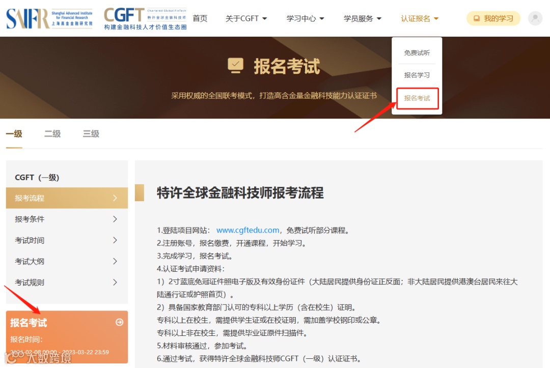 考生可访问并登录特许全球金融科技师官网www.cgftedu.com在“报名考试”栏目下找到对应考试报名入口。(以一级为例)
