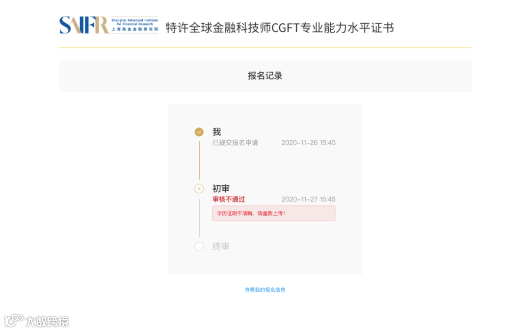 若初审或终审审核不通过,考生需要重新提交考试报名,如下图显示了被驳回的原因。点击重新发起申请重新进行考试报名。