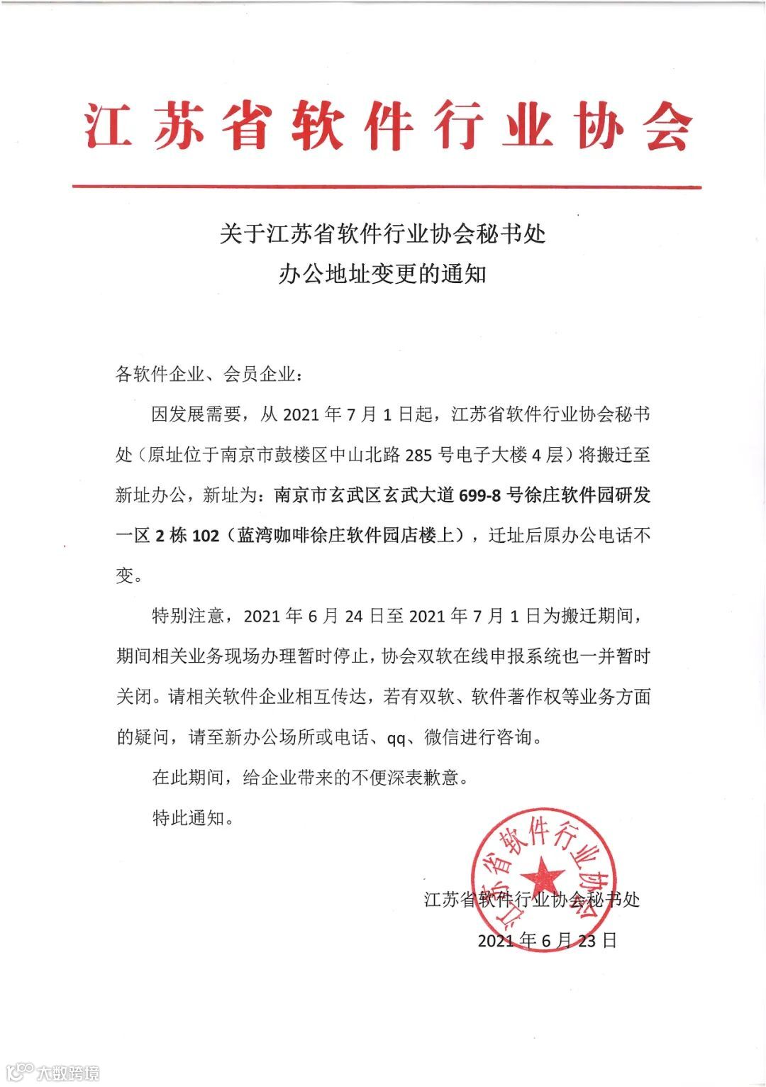 导读:关于江苏省软件行业协会秘书处办公地址变更的通知