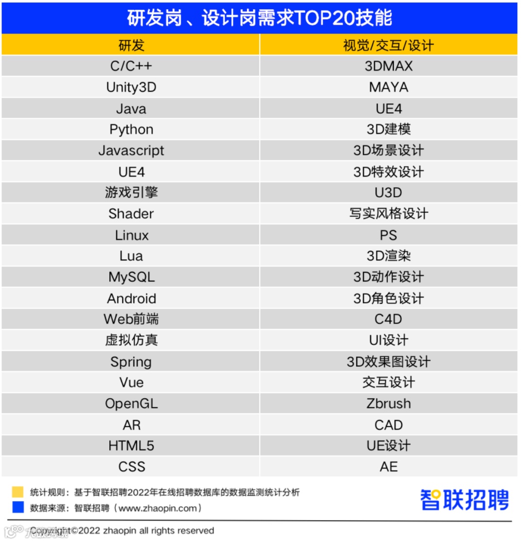 具体技术方面,研发岗位中招聘方所看中的技能排行前列的为 C/C++、Unity3D(U3D)、Java、Python,基本为程序员“通用技 术”。而设计岗则更需要 3DMAX、MAYA、UE4、3D 建模等方面的人才。可见,掌握编程及设计的“程序语言”,就找到了元宇宙的入门密码。
