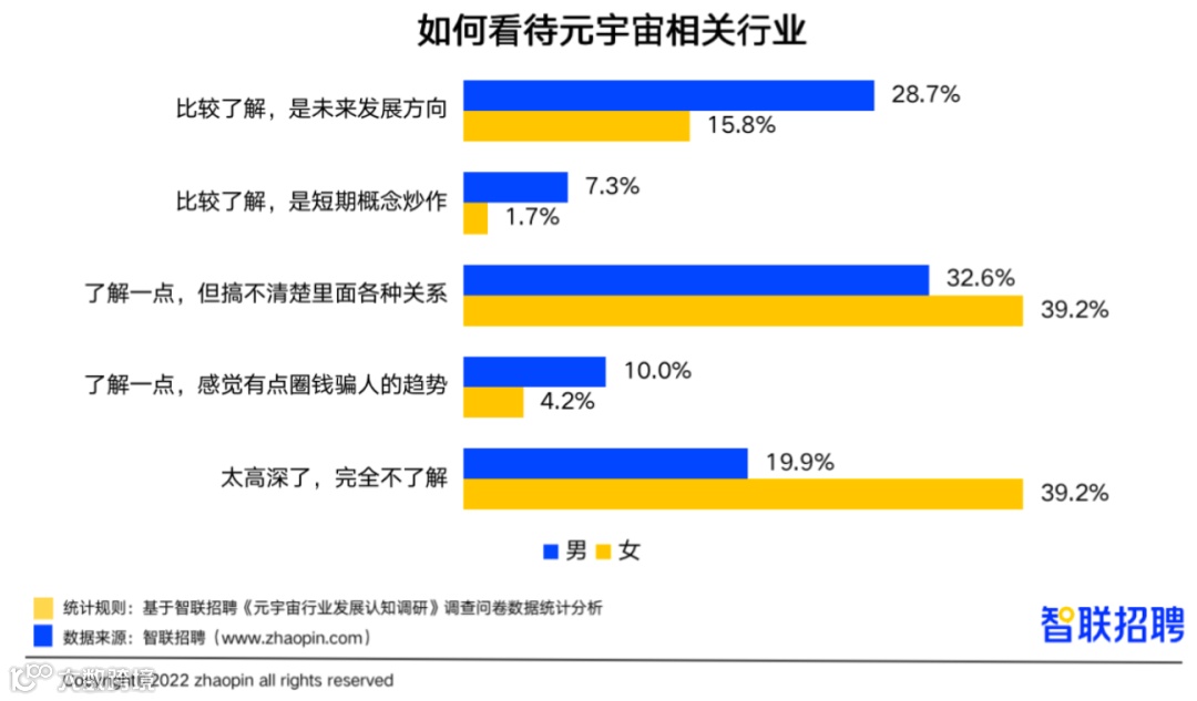 报告发现,仅 30.2% 受访者对元宇宙行业比较了解,26.0%的受访者表示完全不了解。值得注意的是,5.5%的受访者认为其是短期概念炒作、8.1%的受访者认为有 点圈钱的趋势,这表明元宇宙的发展也伴随着质疑的声音。而从性别层面来看,男性对行业的了解程度相对较高,“了解一点、比较了解”的比例高达 78.6%。