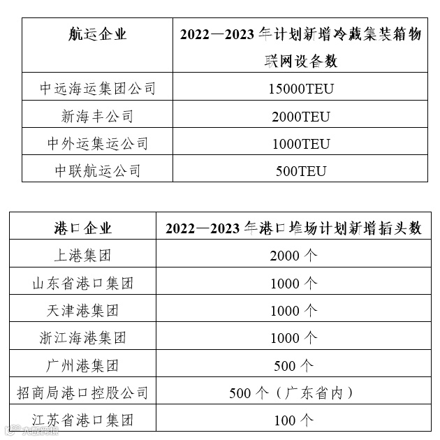 同时,还公开了“冷藏集装箱港航服务提升行动目标分解表”,四家航运企业计划新增18500TEU冷藏集装箱物联网设备,七家港口企业计划新增6100个插头数。