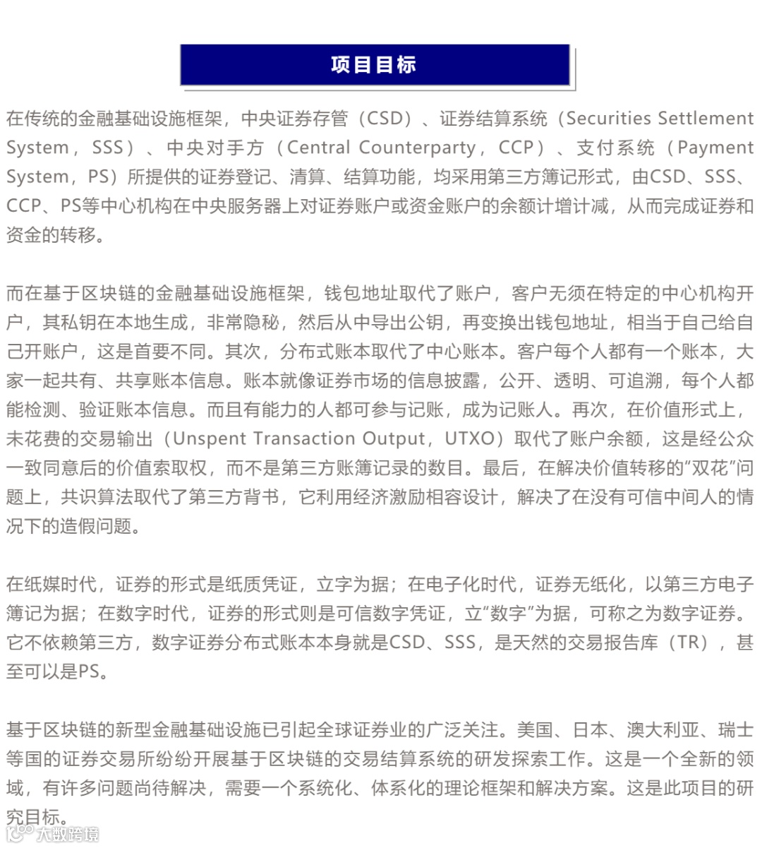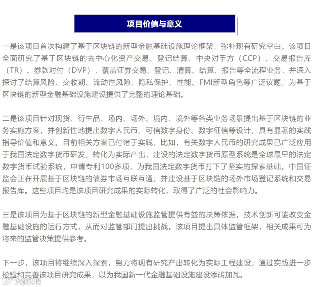 区块链技术发轫于10年前的数字货币浪潮,是新型的价值登记和交换技术,被誉为“信任机器”。如果说证券无纸化、电子化业务处理是信息技术带来的第一次金融基础设施革命,那么证券数字化、去中心化业务处理则将可能是信息技术带来的第二次金融基础设施革命。《基于区块链的新型金融基础设施:理论、实践与监管》研究项目从理论、实践、监管等多重视角对基于区块链的新型金融基础设施进行了全面研究和探索。