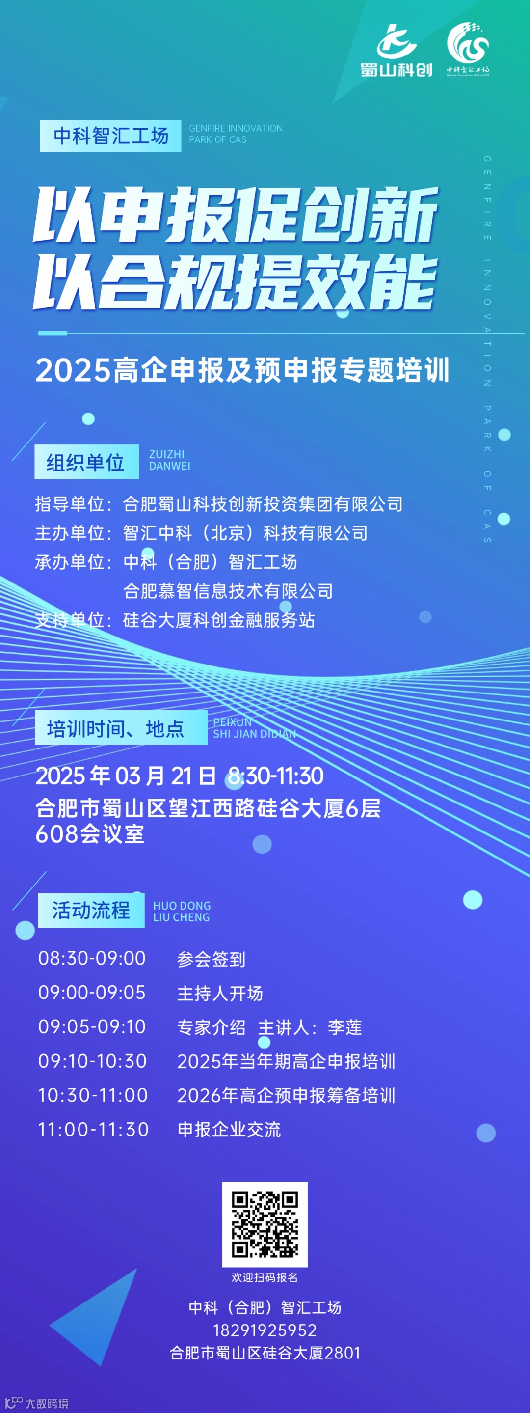 近日,安徽省2025年度高新技术企业认定工作正式开启。高新技术企业认定对企业发展具有重要意义,不仅能够提升企业的品牌形象和市场竞争力,还能享受多项政策红利,为企业创新研发提供强有力的支持。本次培训将为你带来最新的政策解读,详解申报流程,助你准确把握申报方向,提升申报成功率!