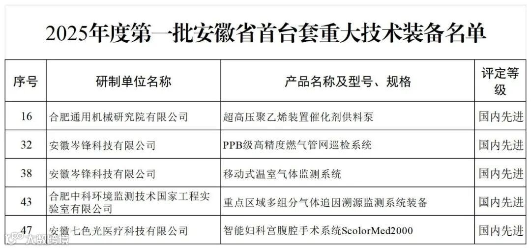 7月22日,安徽省工业和信息化厅公布2025年度第一批安徽省首台套重大技术装备名单,蜀山区企业合肥通用机械研究院有限公司、安徽岑锋科技有限公司、合肥中科环境监测技术国家工程实验室有限公司、安徽七色光医疗科技有限公司4家企业5项产品上榜,获批国内先进。