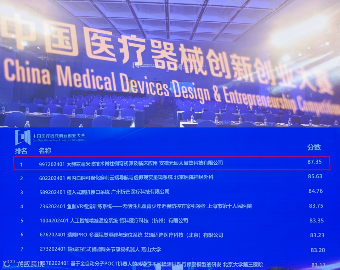 大赛共决出一等奖3名、二等奖6名、三等奖9名、优胜奖17名。“科大硅谷”蜀山园入驻企业安徽元硕太赫兹科技有限公司在赛场上大展身手,分享了“太赫兹毫米波技术脊柱侧弯初筛及临床应用”项目的技术创新点、项目价值、整体成果及未来发展规划,得到在场评审专家、投资机构、同行的广泛关注与认可,以87.35分的绝对优势位列第一名,斩获大赛一等奖!