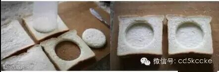 2.将剩下的2张切片面包用杯子压出一个圆圈,放在底面切片面包上。