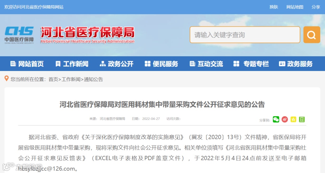 1.河北省医保局:现就省级医用耗材集中带量采购向社会公开征求意见