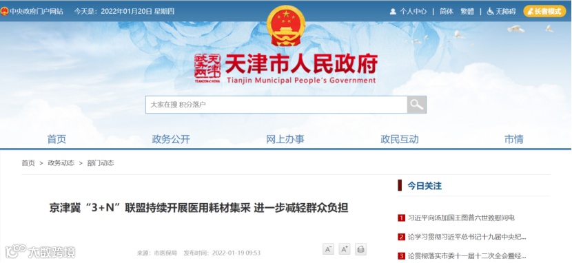 1月19日,天津市人民政府网发布部门动态,公布京津冀“3+N”联盟人工晶体、药物球囊、起搏器等医用耗材集采情况。