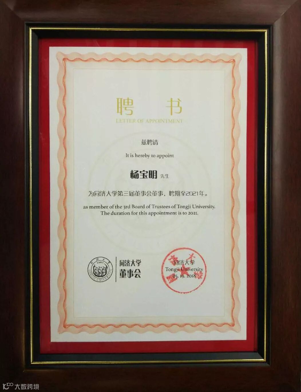 2018年 5月19日,同济大学第三届董事会第三次全体会议在上海召开。会上,同济大学党委书记、董事会主席方守恩正式向上海鲁班软件股份有限公司杨宝明博士授予同济大学董事会董事的聘书。