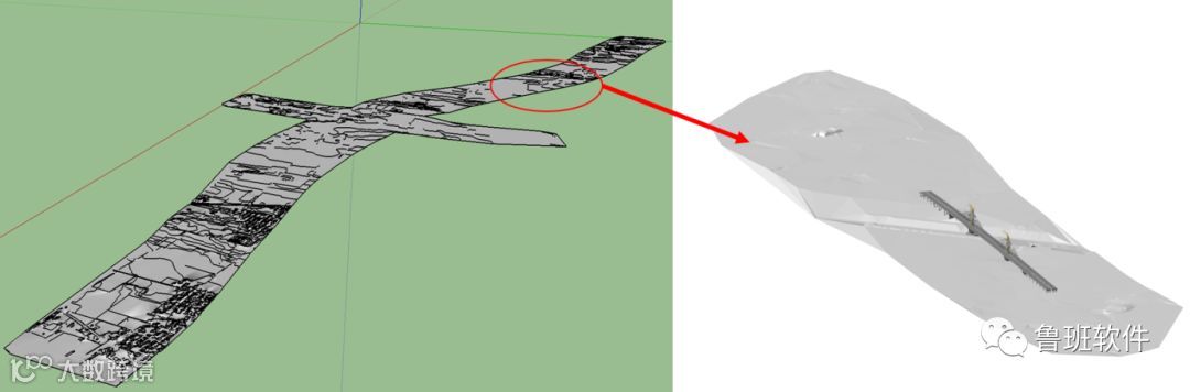 2. 南水北调特大桥地形模型建立 因桥梁工程本身对地形地貌勘测数据要求高,本项目利用设计院给出的CAD地形图,导入到Sketch Up自动生成的三维地形模型,地形地貌数据更加直观,也提高了模型的准确性。